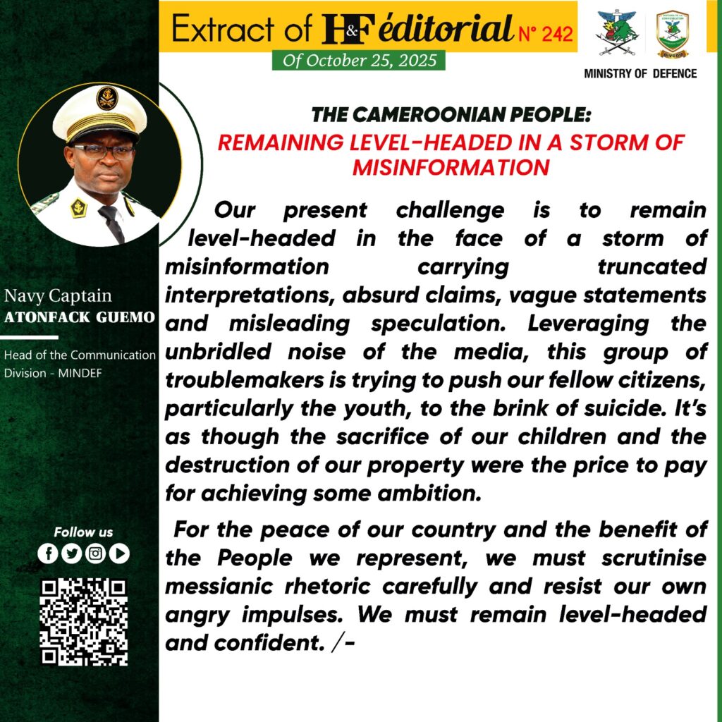 La grandeur d’un Peuple se forge à l’aune des défis qu’il aura relevés tout au long de son histoire. Réalité factuelle qui demeure une constante identitaire des peuples portés par le désir d’affirmation, et l’audace du progrès. Dans un environnement géopolitique international suffisamment trouble et à l’horizon indéchiffrable, conséquence de la compétition acharnée entre d’une partie, la résurgence de totalitarismes hégémoniques, et l’apparition d’un courant souverainiste plus distributif d’autre partie, le Peuple camerounais se doit de tracer sa propre voie, pour son propre devenir.